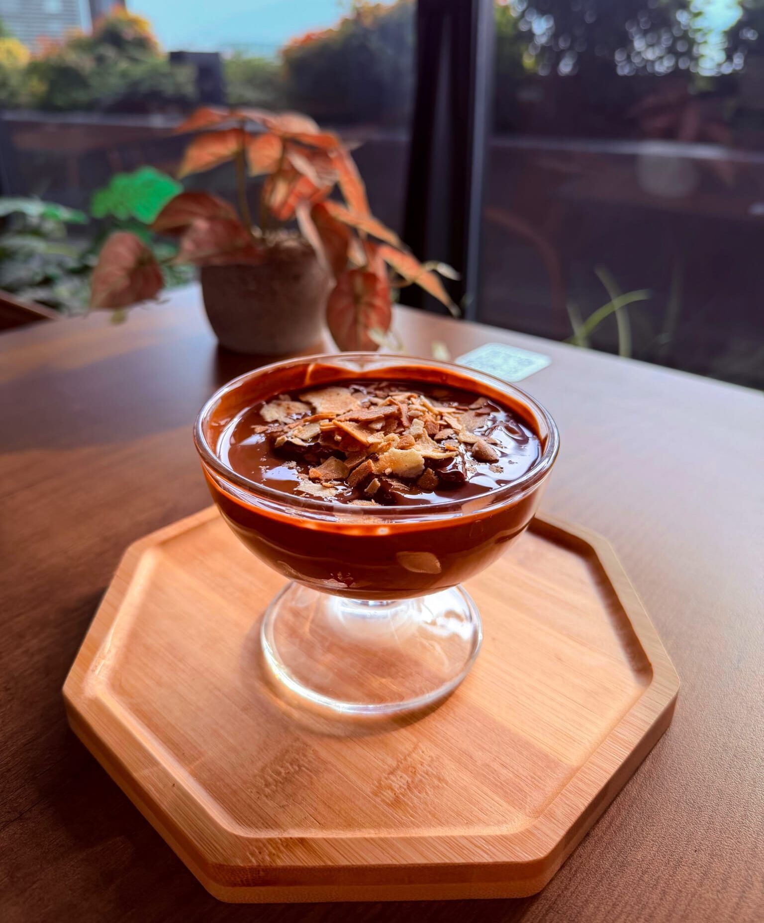 Kraken’in imza tatlısı. Fındıklı ve bademli unsuz özel mousse keki, arasına fıstıklı kreması, fıstık tozu ve file badem. Üzerine gerçek beyaz Belçika çikolatasıyla…
