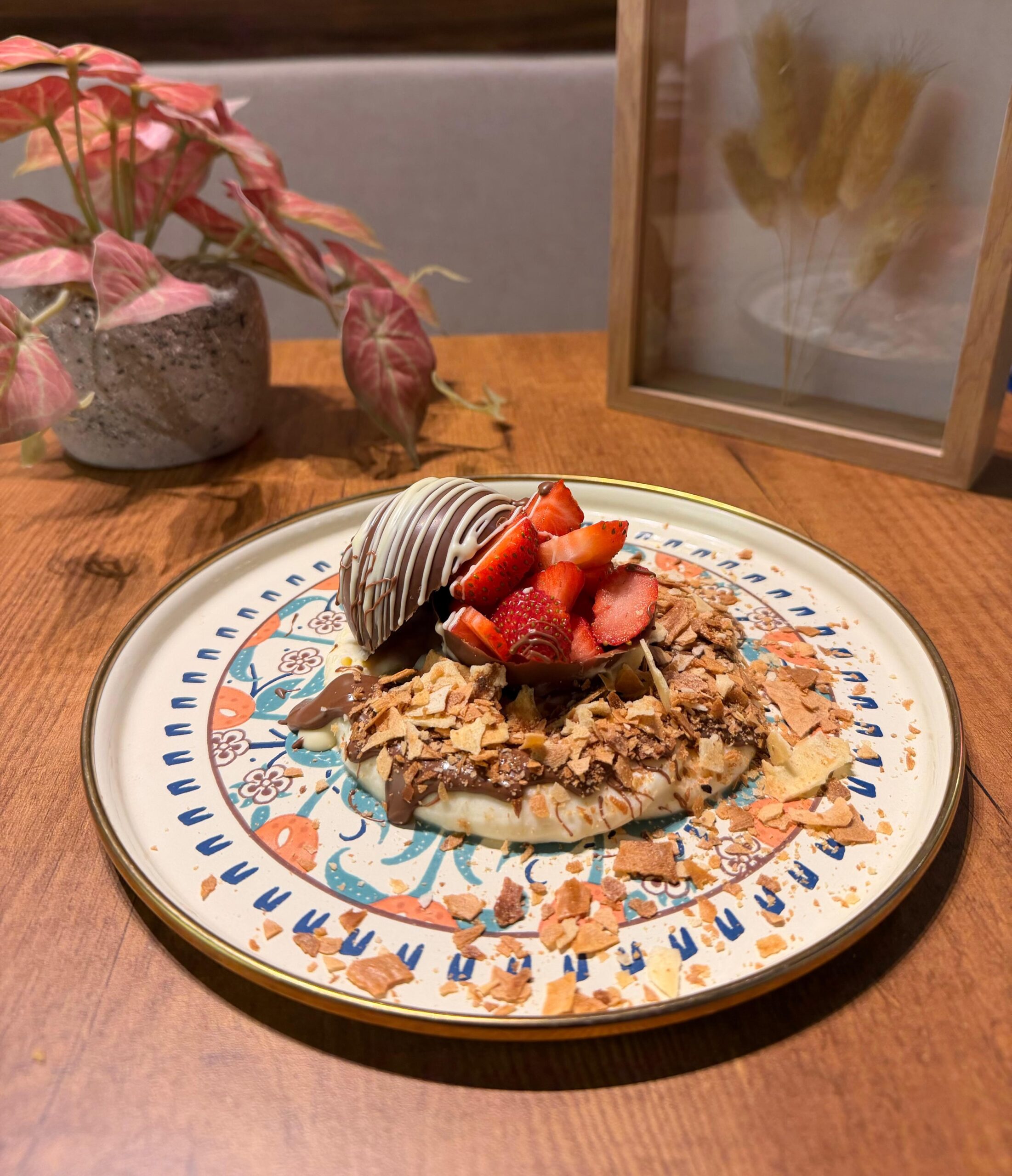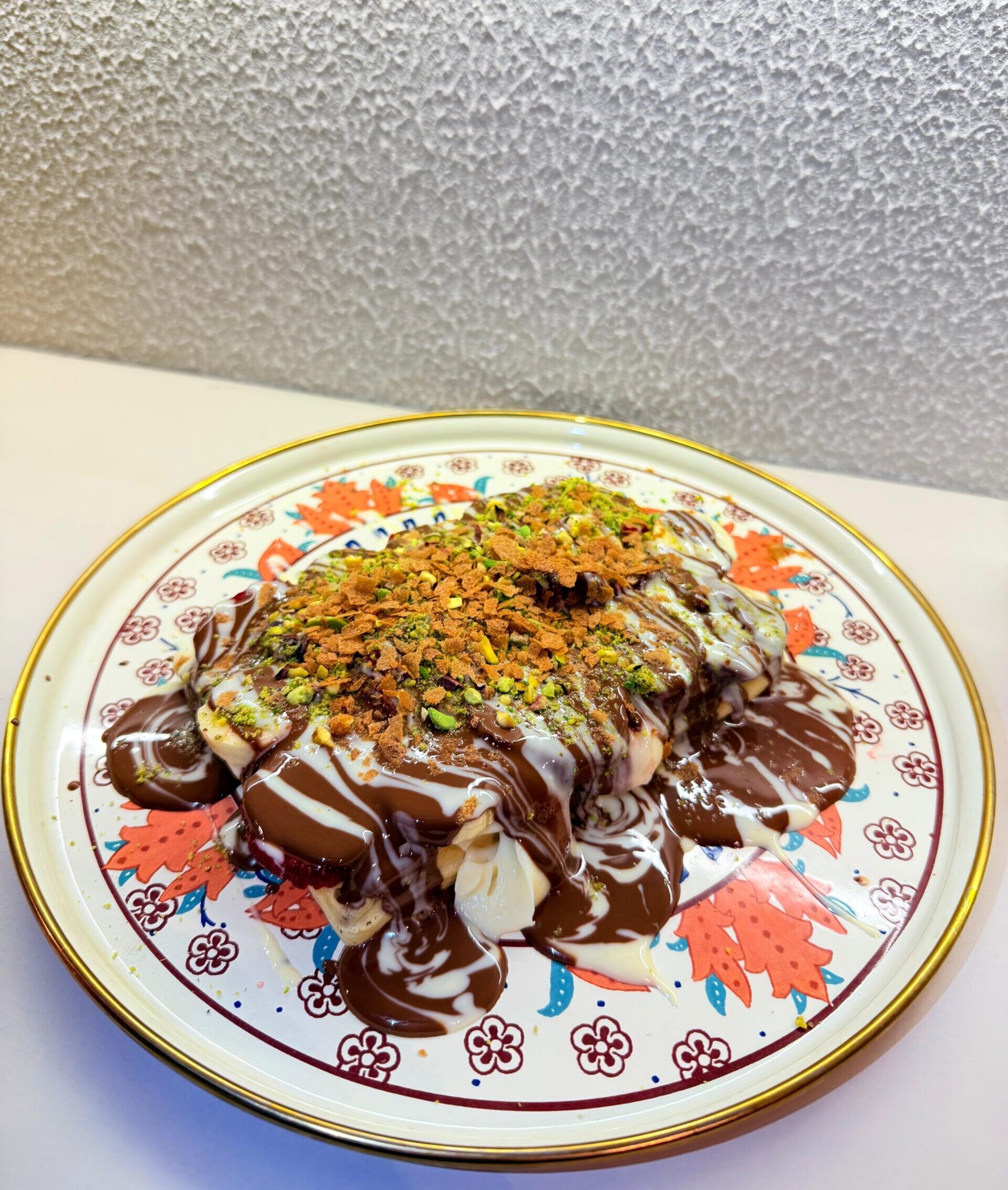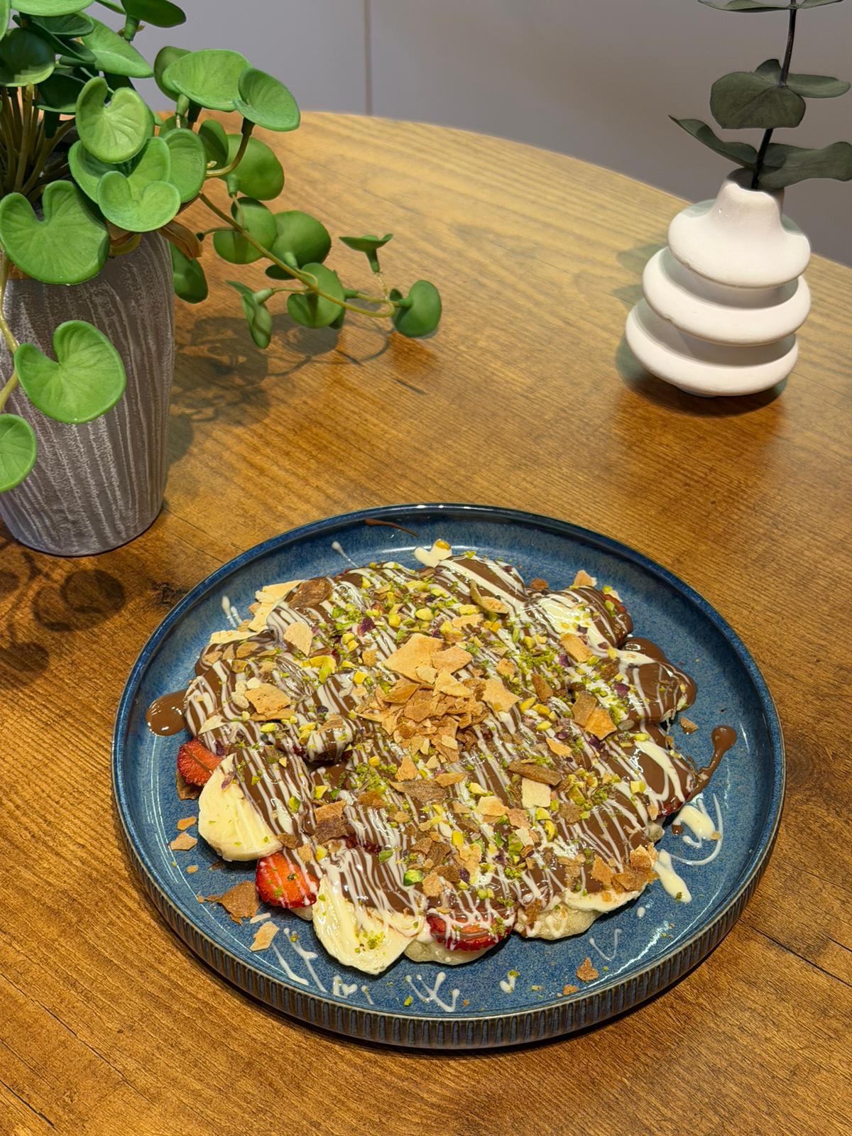 Çıtır Waffle hamuru, özel kreması, toz fıstık, pirinç fıstık, bolca çilek ve muz, krep kırığı ve üzerine gerçek Belçika çikolatası…