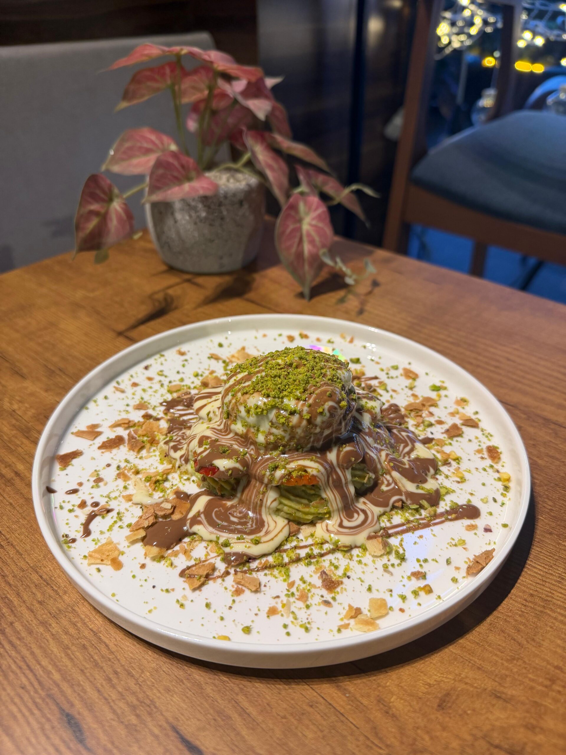 Yumuşacık bisküvili kek, Kraken’in özel kreması ve fıstıklı krema, fıstık tozu ve yoğun gerçek Belçika çikolatasıyla…